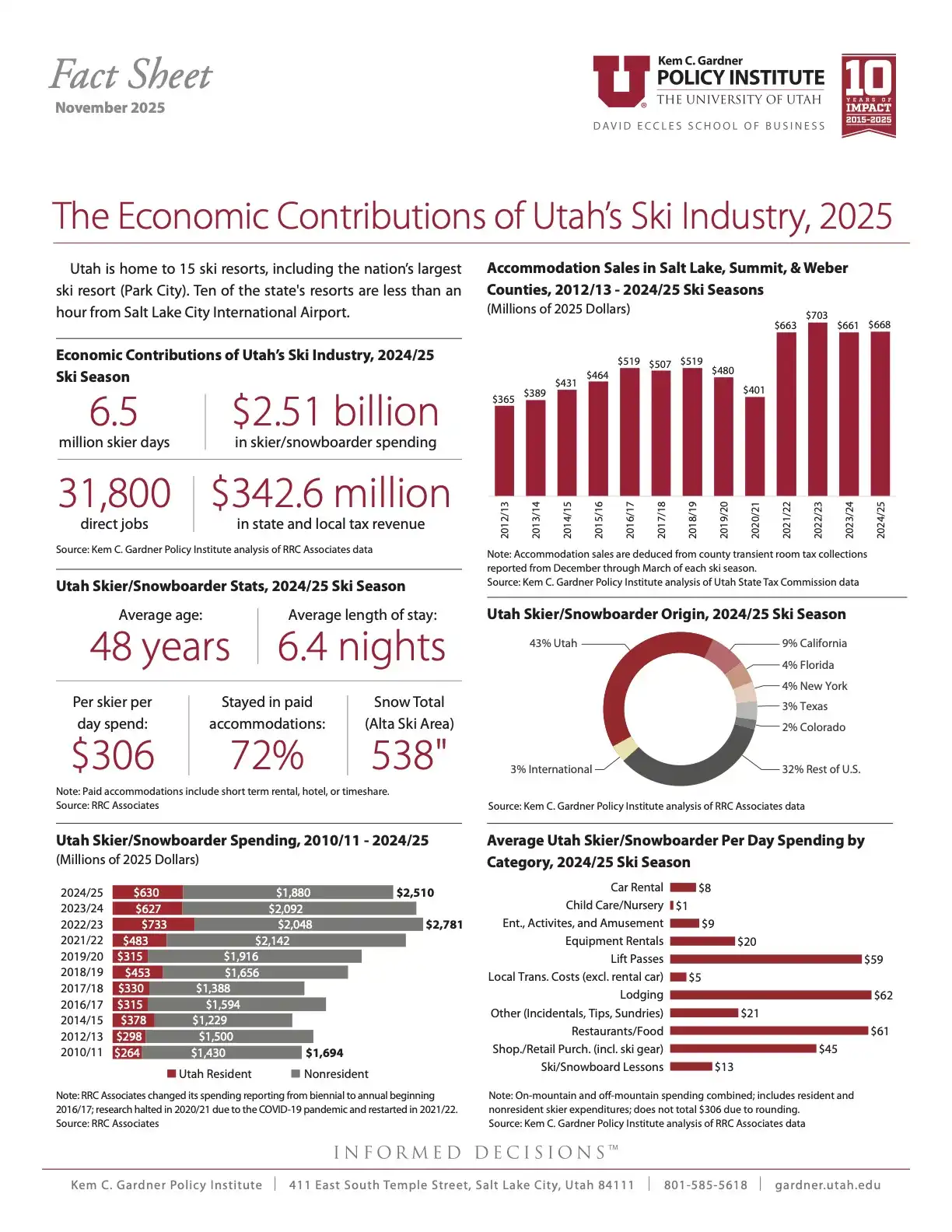 During the 2024/25 ski season, Utah’s ski industry generated $2.51B in skier and snowboarder spending. That activity produced $342.6M in state and local tax revenue and supported 31,800 direct jobs. Utah recorded 6.5M skier days, with average spending of $306 per skier per day.